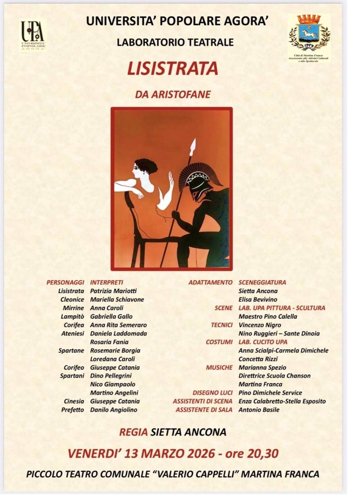 Venerdì 13 marzo ore 20.30, al Piccolo Teatro Comunale Valerio Cappelli, l’Università Popolare Agorà-Laboratorio Teatrale porta in scena “Lisitrata”, celebre commedia di Aristofane.