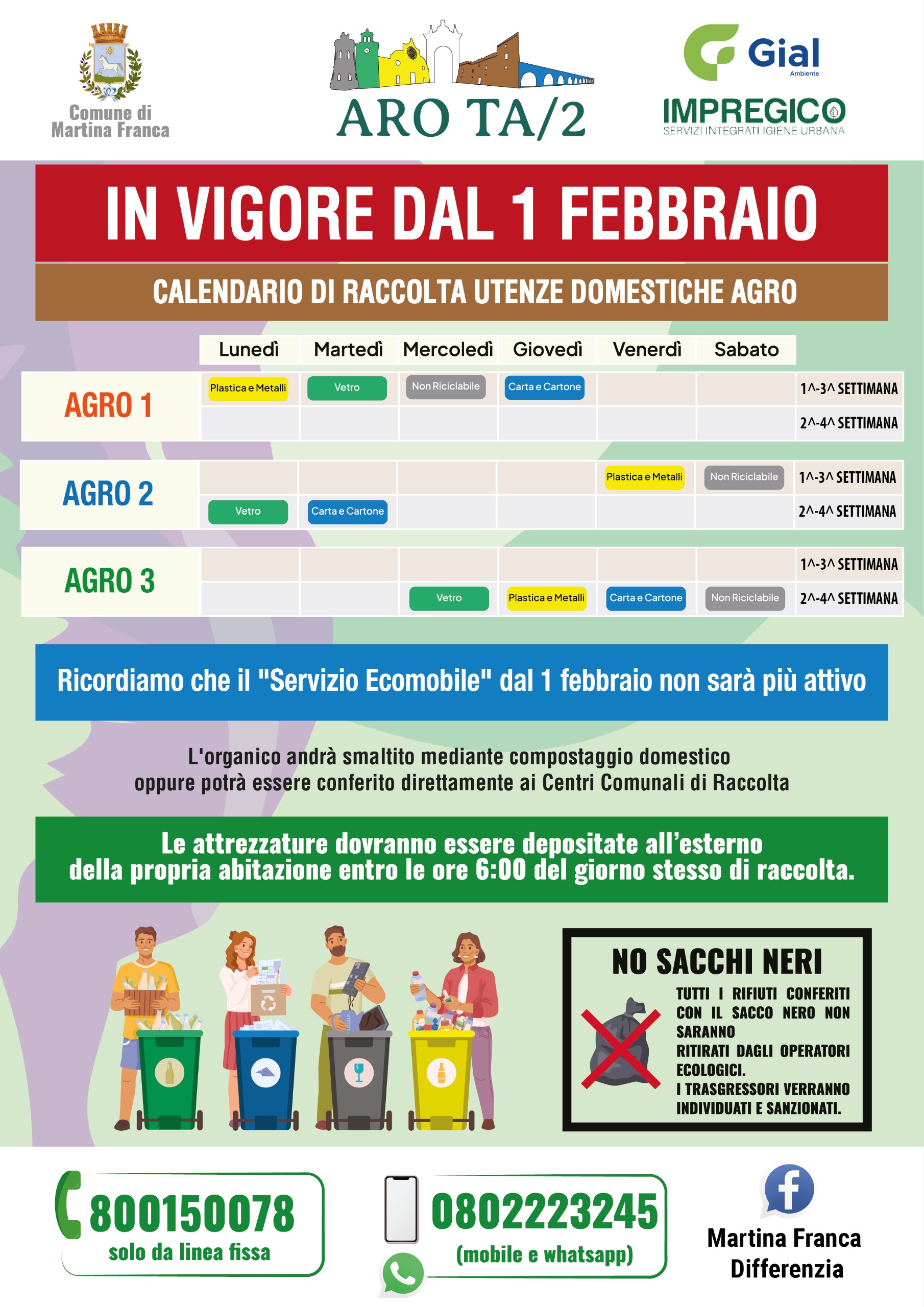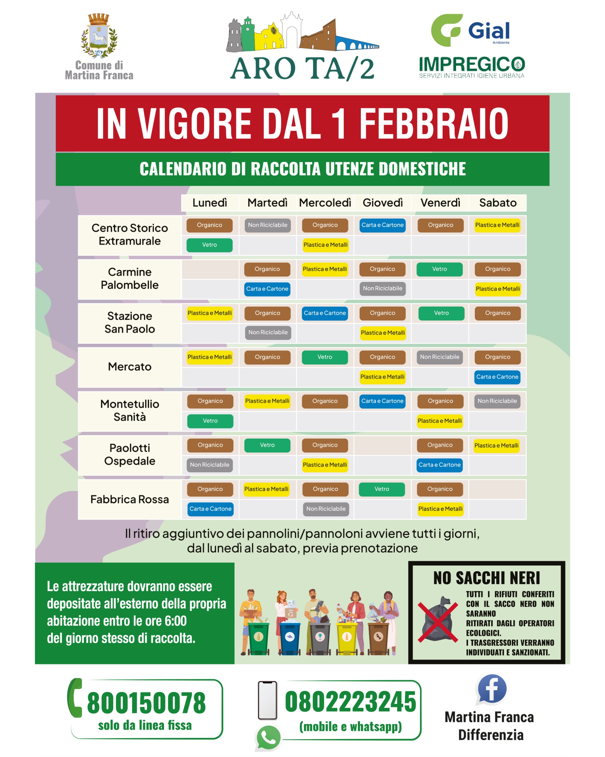 A partire dal 1° febbraio entreranno in vigore i nuovi calendari per la raccolta differenziata dei rifiuti.