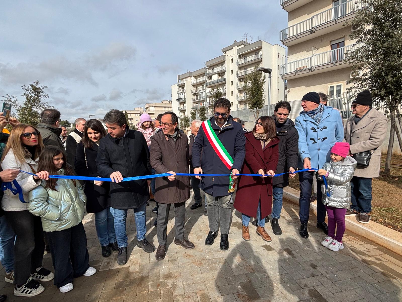 Il Sindaco Gianfranco Palmisano, l’Assessore ai Lavori Pubblici e Vicesindaco Nunzia Convertini, gli Assessori e i Consiglieri di maggioranza hanno inaugurato questa mattina il sistema di raccolta, trattamento e riutilizzo delle acque piovane della zona di viale Stazione e la nuova area giochi realizzata nell’area sovrastante. La prima opera è già in funzione mentre l’area con le attrezzature ludiche è stata messa a disposizione dei cittadini.