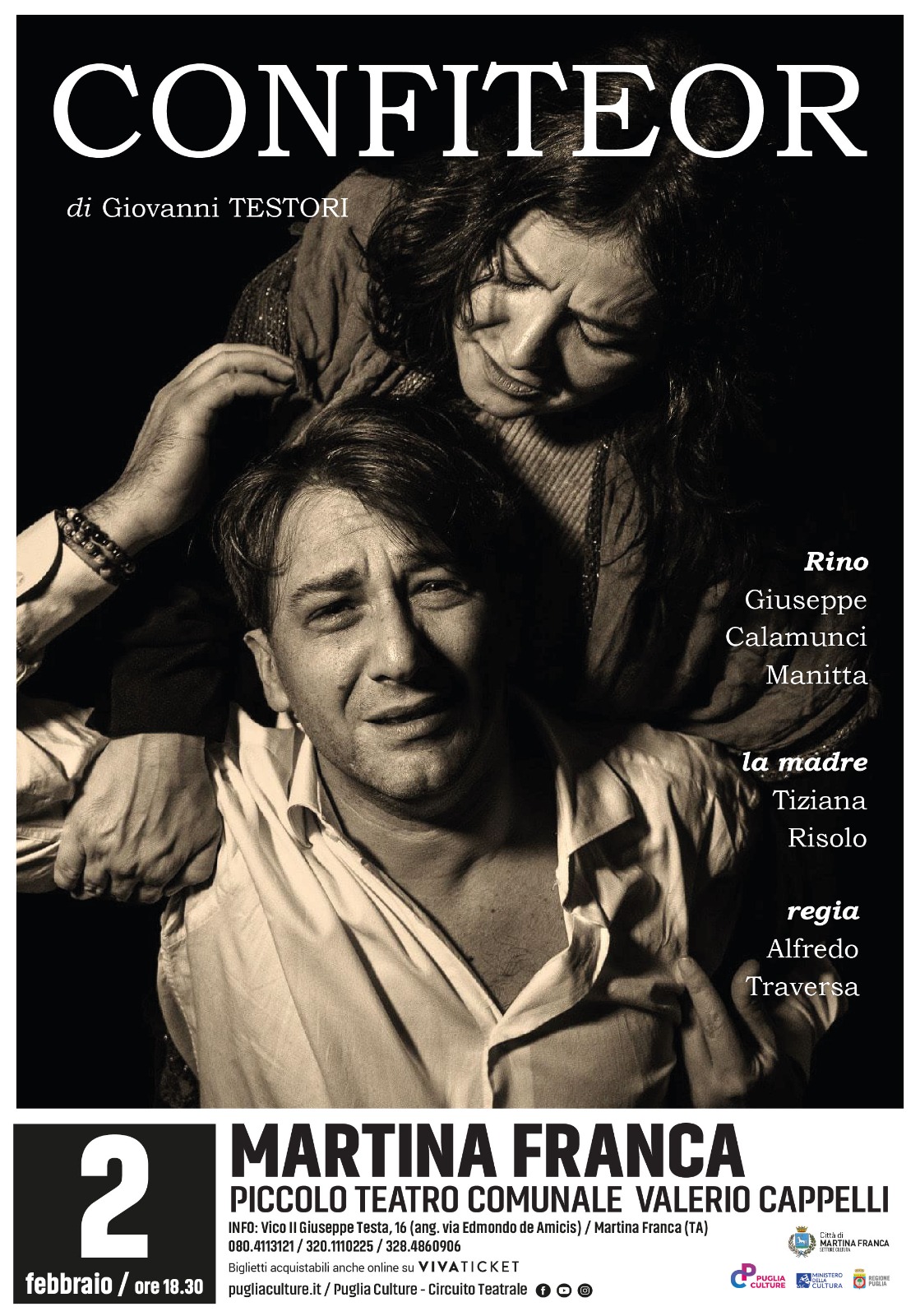 “La scelta di Confiteor si inserisce in un percorso di valorizzazione della produzione drammaturgica italiana. Giovanni Testori è una delle figure emblematiche di un teatro teso alle sue più intime radici, alle sue originarie finalità. Un mezzo per parlare allo spettatore, con lo spettatore e – in un certo qual modo – dello spettatore affinché il messaggio teatrale possa essere anche capace di com-patire con chi lo ascolta e lo guarda. La versione diretta da Alfredo Traversa che vede Giuseppe Calamunci Manitta e Tiziana Risolo come protagonisti, siamo certi arriverà al cuore degli spettatori, avendo già registrato numerosi apprezzamenti da parte degli spettatori di tutta Italia. Dopo l’ottima esecuzione scenica di Domenico Clemente, rilevata nello spettacolo precedente – inserito nella stagione teatrale – anche questo riteniamo riceverà il giusto riconoscimento del pubblico, soprattutto per la firma autoriale che dà ulteriore lustro agli spettacoli in cartellone”, ha dichiarato l’Assessore alle Attività Culturali e allo Spettacolo, Carlo Dilonardo.