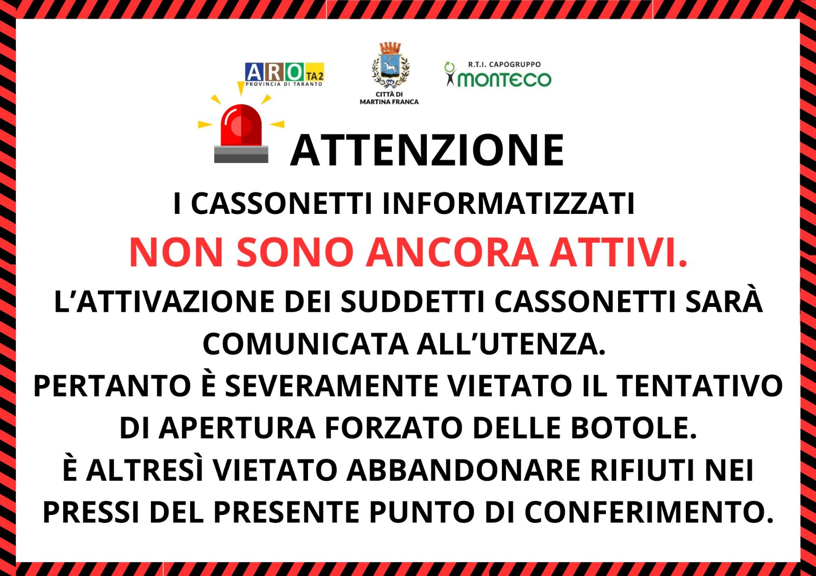 Pertanto, si invitano i cittadini a non effettuare alcun tentativo per aprire i suddetti cassonetti forzando le botole e a non abbandonare i rifiuti nel punto in cui saranno collocati.