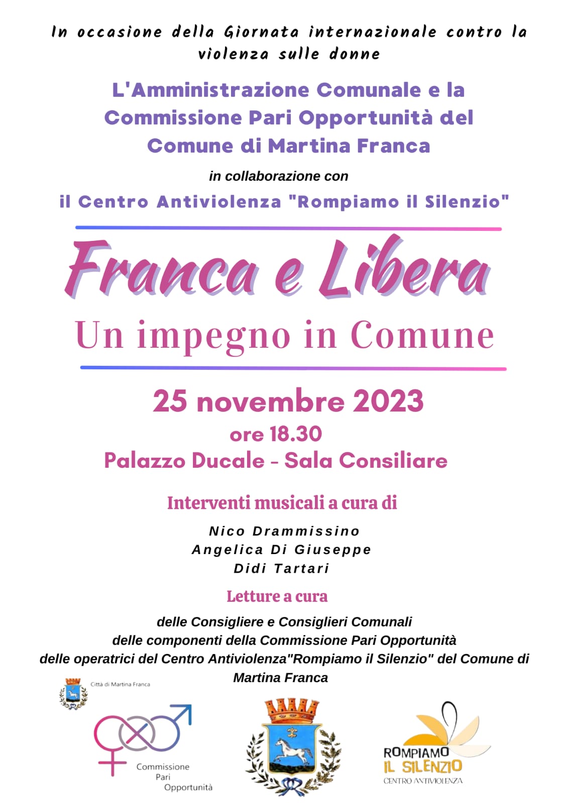 Sabato 25 novembre, in occasione della Giornata internazionale contro la violenza sulle donne, con inizio alle ore 18,30 nella Sala Consiliare, si svolgerà “Franca e Libera – Un impegno in Comune”.