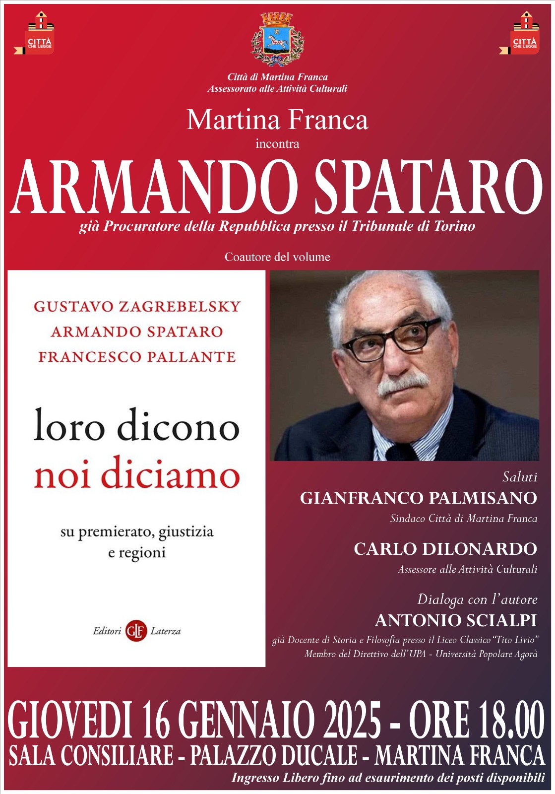 Giovedì 16 Gennaio, presso la Sala Consiliare del Palazzo Ducale, alle ore 18.00 Armando Spataro, già Procuratore della Repubblica presso il Tribunale di Torino incontrerà la cittadinanza, scuole e associazioni per presentare il volume - edito da Laterza - Loro dicono. Noi diciamo, scritto con gli illustri giuristi Gustavo Zagrebelsky e Francesco Pallante.