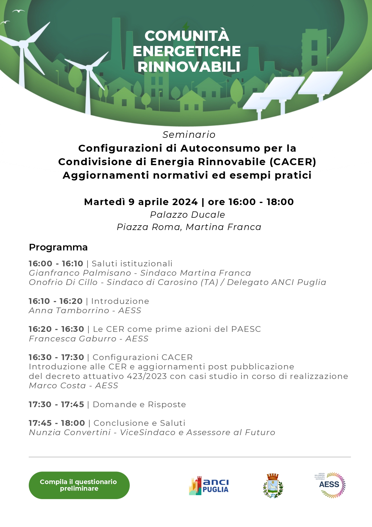 Dopo i saluti istituzionali del Sindaco di Martina Gianfranco Palmisano e del Sindaco di Carosino Onofrio Di Cillo delegato ANCI Puglia, introdurrà i lavori Anna Tamborrino dell’AESS. Seguiranno gli interventi su Le CER come prime azioni del PAESC (Piano d’Azione per l’Energia Sostenibile), a cura di Francesca Gaburro (AESS), Configurazioni CACER - Introduzione alle CER e aggiornamenti post pubblicazione del decreto attuativo 423/2023 con casi studio in corso di realizzazione, a cura di Marco Costa (AESS). Concluderà il Vicesindaco e Assessore al Futuro Nunzia Convertini dopo uno spazio dedicato a domande e risposte.