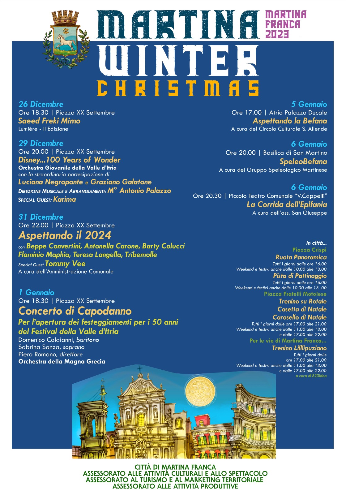 Gli eventi del cartellone di Martina Winter Christmas proseguono in questi giorni in città. Musica, luminarie e altre iniziative per grandi e piccoli. Intanto è conto alla rovescia per la serata di fine anno in piazza XX Settembre, "Aspettando il 2024", a cura dell'Amministrazione Comunale. Start alle ore 22,00.