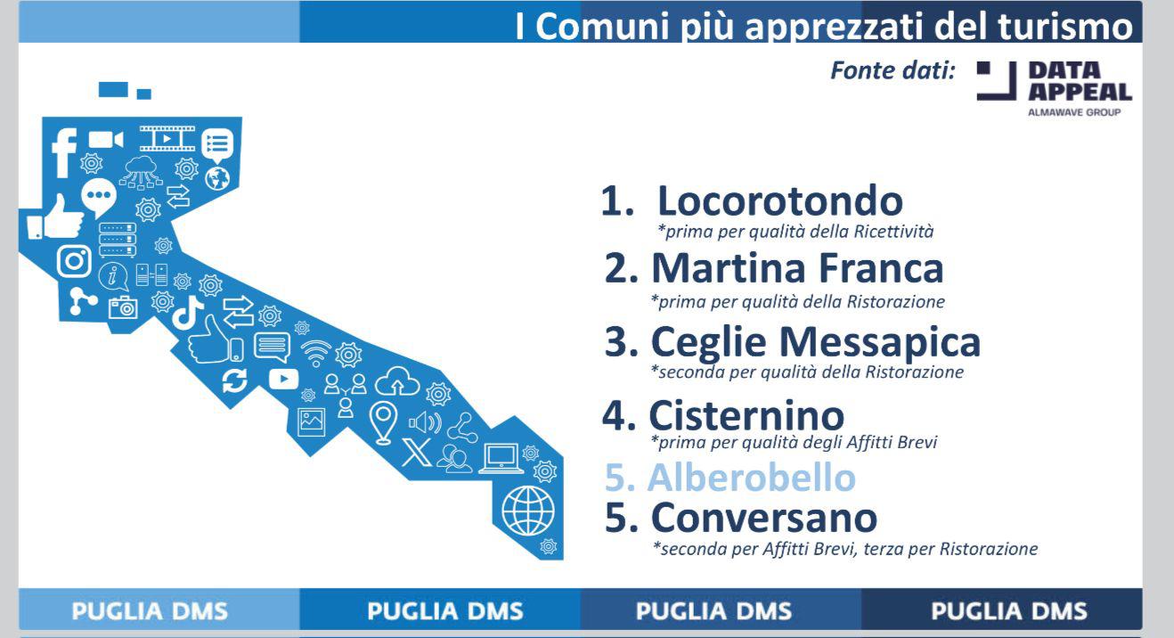 L’altra bella notizia è che a farla da padrone in questo scenario è stata l’intera Valle d’Itria, perché i 5 Comuni premiati sono esattamente: Locorotondo, Martina Franca, Ceglie Messapica, Cisternino e Conversano. Alberobello invece è risultato il Comune più popolare e più ricercato sul web.