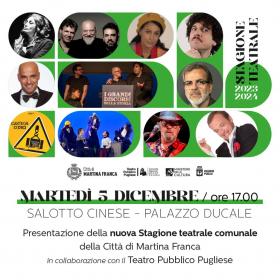 La Stagione Teatrale 2023-2024 della Città di Martina Franca organizzata dall’Amministrazione Comunale in collaborazione col Teatro Pubblico Pugliese si svolgerà martedì 5 dicembre alle ore 17.00, nel Salotto Cinese (o Sala degli Uccelli) di Palazzo Ducale.