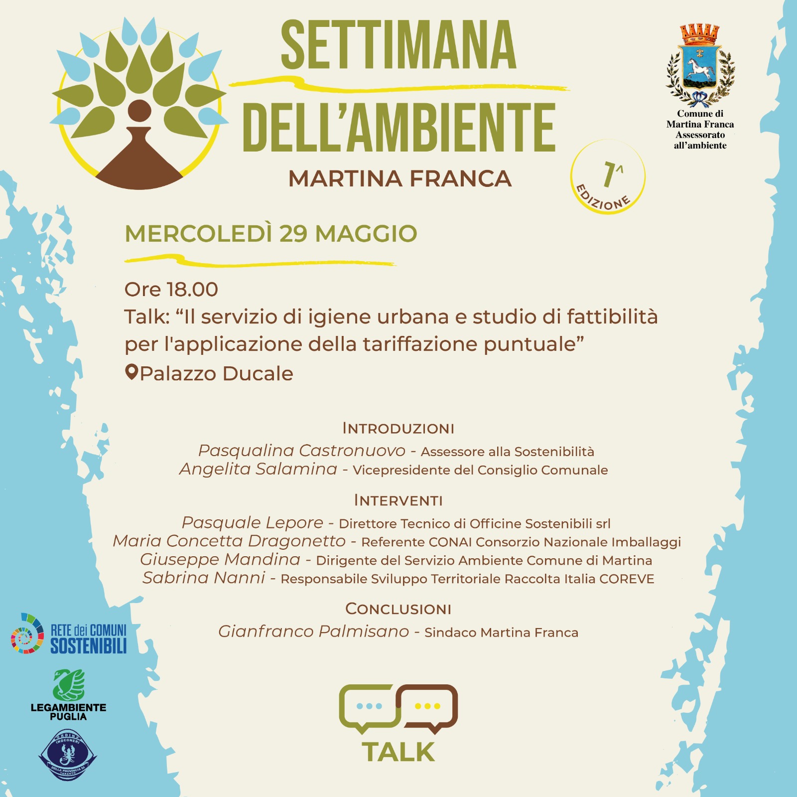 Il primo appuntamento è con il talk di mercoledì 29 maggio, alle ore 18 a Palazzo Ducale, sul tema del “Servizio di igiene urbana e lo studio di fattibilità per l’applicazione della tariffazione puntuale”. Ne parlano Pasquale Lepore, direttore tecnico di Officine Sostenibili, azienda specializzata nella progettazione di servizi di igiene urbana e comunicazione ambientale; Maria Concetta Dragonetto, referente per l’Area Piani di Sviluppo RD Centro Sud Italia del Consorzio Nazionale Imballaggi Conai; il dirigente comunale Giuseppe Mandina per il Servizio Ambiente e Sabrina Nanni, responsabile di Sviluppo Territoriale Raccolta Italia Coreve. Saluti e conclusioni saranno a cura dell’assessore all’Ambiente Pasqualina Castronuovo, della vicepresidente del Consiglio comunale Angelita Salamina e del sindaco Gianfranco Palmisano.