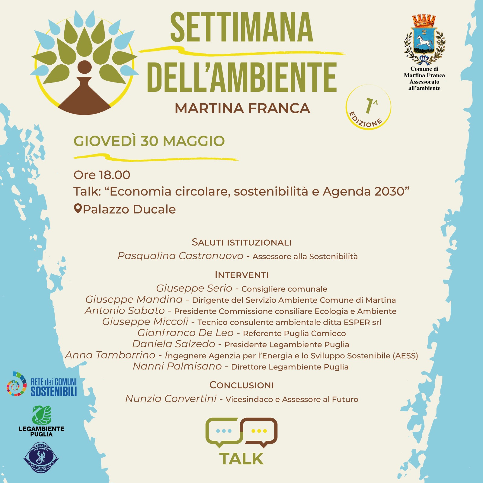 La chiusura dell’iniziativa è affidata al secondo talk, giovedì 30 maggio alle ore 18 a Palazzo Ducale. Su “Economia circolare, Agenda 2030 e sostenibilità” interverranno il dirigente comunale Giuseppe Mandina; Antonio Sabato, presidente della commissione consiliare Ecologia e Ambiente; Giuseppe Miccoli in qualità di consulente della società Esper che da anni opera nell’ambito della pianificazione sistemica ambientale sia come ente di ricerca che affiancandosi a enti locali; Gianfranco De Leo, referente Puglia Comieco; Daniela Salzedo e Nanni Palmisano, rispettivamente presidente e direttore di Legambiente Puglia; Anna Tamborrino per l’Agenzia Energia e Sviluppo Sostenibile. Saluti e conclusioni dell’assessore all’Ambiente Pasqualina Castronuovo, del consigliere comunale Giuseppe Serio e Nunzia Convertini, vicesindaco e assessore al Futuro.