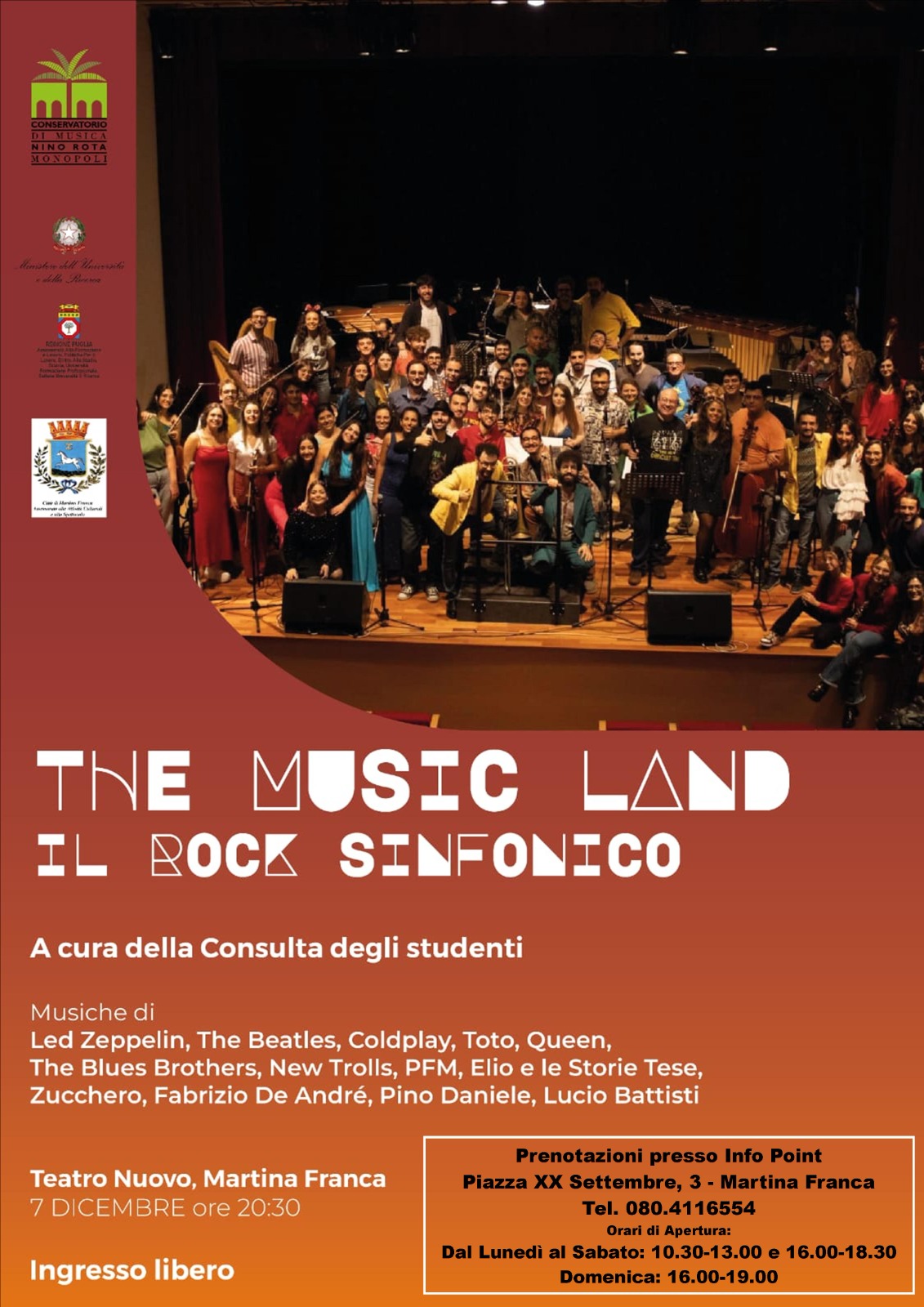 Si terrà Giovedì 7 Dicembre alle ore 20.30 presso il Teatro Nuovo di Martina Franca, l’evento “The music land. Il rock sinfonico” interamente ideato e realizzato dalla Consulta degli studenti del Conservatorio “Nino Rota” di Monopoli, grazie al contributo della Regione Puglia, Assessorato alla Formazione e al Lavoro, Settore Università e Ricerca e del Comune di Martina Franca, Assessorato alle Attività Culturali e allo Spettacolo.