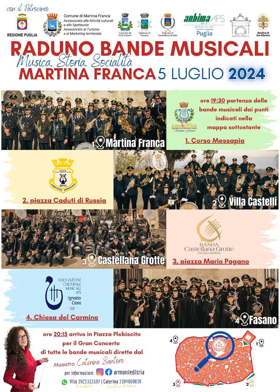 Il Raduno Bande Musicali, evento unico nel suo genere, inserito nel programma "Martina Vento D’Estate 2024", si svolgerà venerdì 5 luglio dalle 19:30 alle 21:30 e promette di offrire una serata indimenticabile all'insegna della musica e della cultura.
